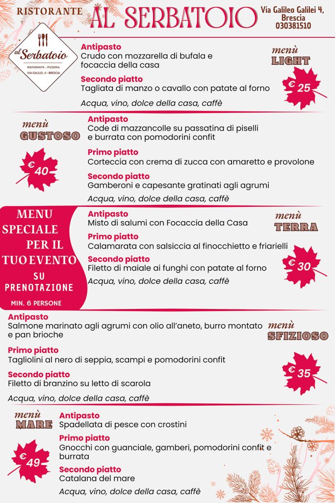 F.lli Ruocco S.n.c. di Ruocco Raffaele, Ruocco Marco e Ruocco Rosa Maria - Sede Legale/Operativa: 4, Via Galilei - 25128 Brescia (BS) - ItaliaP.I./Codice Fiscale 03423780174 - Tel. +39 030 381510 - Email: info@ristorantealserbatoio.com - PEC: fratelliruocco@legalmail.itUfficio del Registro delle Imprese: Brescia - Numero REA: BS - 394735